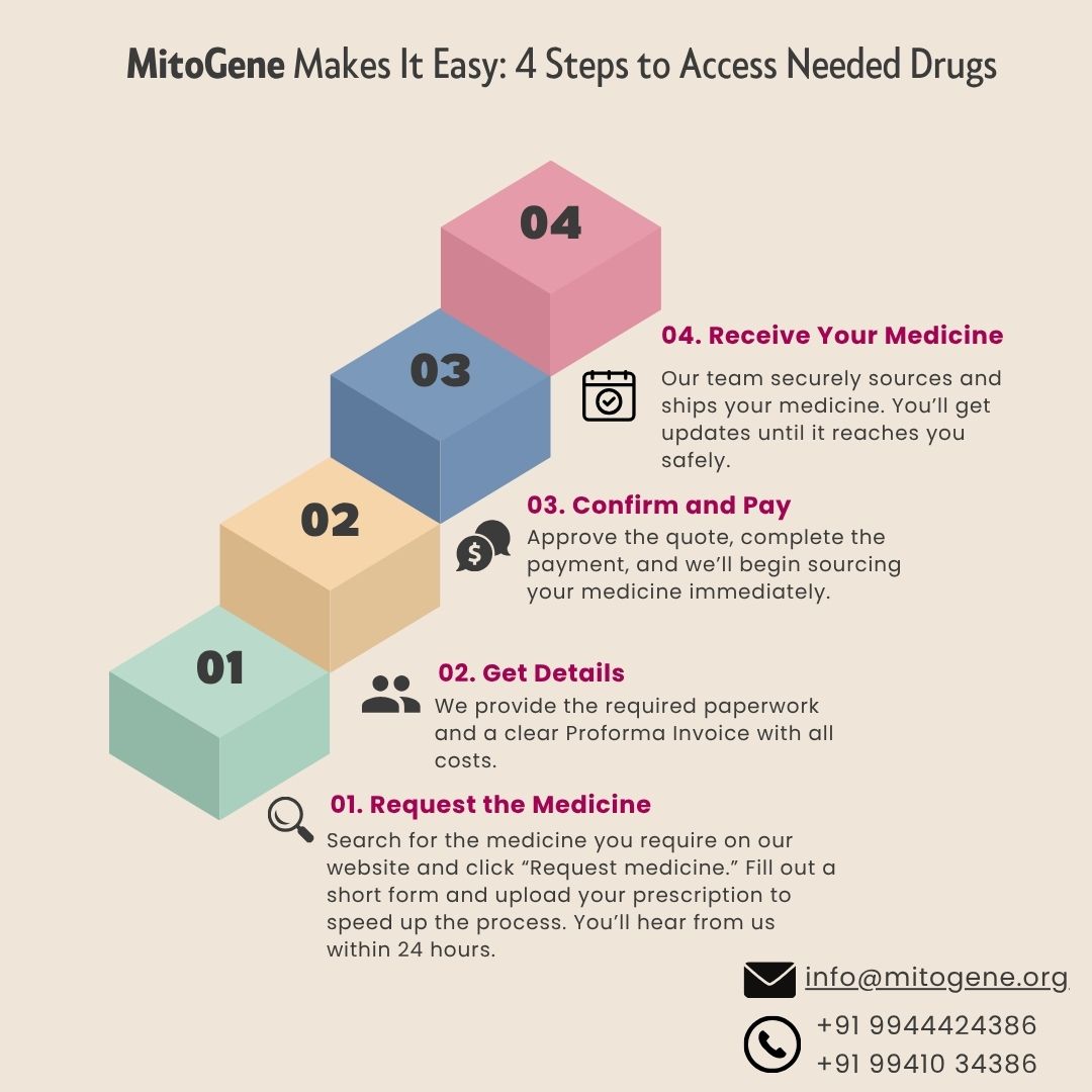 MitoGENE facilitates patient-specific access to medicines under Named Patient Program permitted by CDSCO through Form 12B. The products mentioned are not approved for commercial sale in India. Access is strictly for personal use under physician supervision. Information provided on this website is sourced from publicly available references, and MitoGENE is not responsible for its completeness or accuracy. MitoGENE does not promote or sell unapproved drugs.
